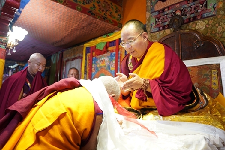 當日下午,在扎什倫布寺拉讓日光殿,班禪登上法座,接受扎什倫布寺管委會僧人成員、高僧朝拜,為他們摸頂賜福,并帶領高僧誦經(jīng)祈福。