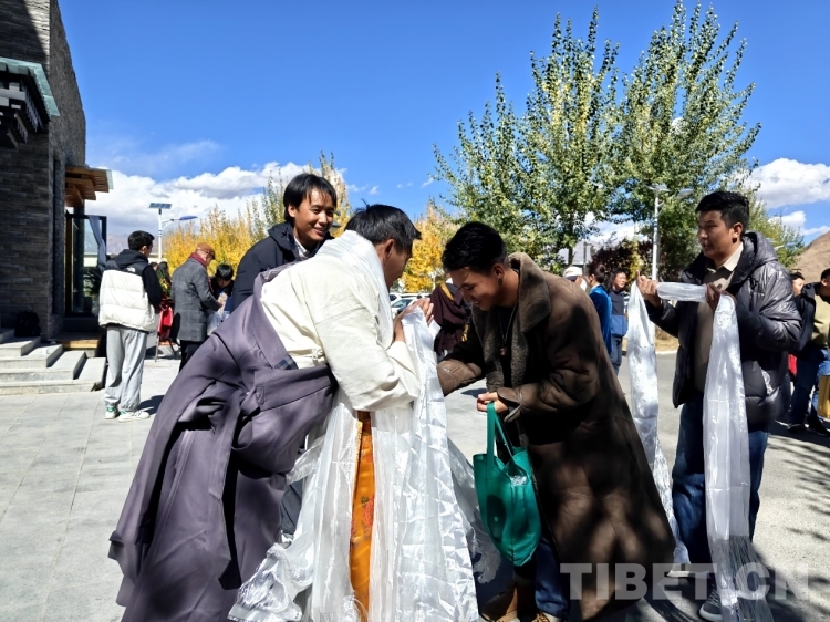 圖為學(xué)生們向丹巴繞旦之子、西藏丹巴繞旦唐卡藝術(shù)學(xué)校校長(zhǎng)旦增平措敬獻(xiàn)哈達(dá),表達(dá)對(duì)丹巴繞旦教授的敬意
