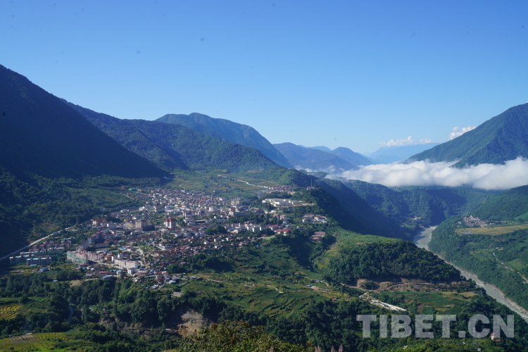 圖為清晨云海散去的墨脫縣縣城全景,北側(cè)是雅魯藏布江峽谷 攝影:德吉卓瑪