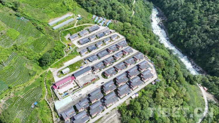 圖為搬遷后的墨脫縣背崩鄉(xiāng)巴登村全貌(航拍圖),整個(gè)村莊位于雅魯藏布江大峽谷西側(cè)的山坡上,村莊的西側(cè)是茶園。圖片由墨脫縣融媒體中心提供