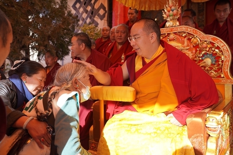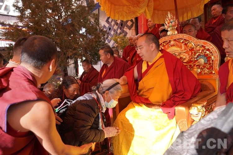 71歲的次仁曲珍老家在日喀則市拉孜縣,當天在女兒的陪伴下拄著拐杖來到扎什倫布寺等候班禪摸頂賜福。看到老阿媽慢慢走近,班禪露出關切的神情,俯身向前,雙手接過哈達掛在老人的脖子上,輕輕為她摸頂,并祝福老人健康長壽。