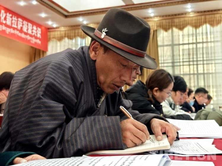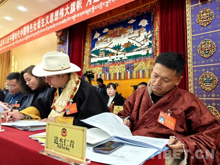 圖為政協(xié)委員認真審閱藏文版會議資料 攝影:次旦拉姆