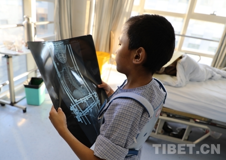 病房內(nèi),9歲的扎西曲培已經(jīng)完成了手術(shù),在病房里奔走玩耍。他煞有介事地拿起自己的x光片,說“這是我的,快治好的?!崩畲镜抡f,“這個小男孩調(diào)皮得很,天天很活躍,眼睛里都是機靈。剛來的時候他肩膀一個高一個低,肩胛骨也不對稱,如今走路的時候形態(tài)完全正常,身高長了12公分,因為年齡小,將來恢復(fù)估計會更好一些?!?/p>
