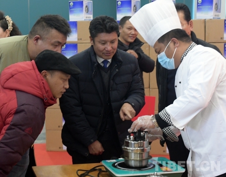 那曲市委常委、常務副市長白瑪羅布(中)在捐贈活動現(xiàn)場,觀看高原節(jié)能鍋的使用演示(唐召明2023年12月26日攝)