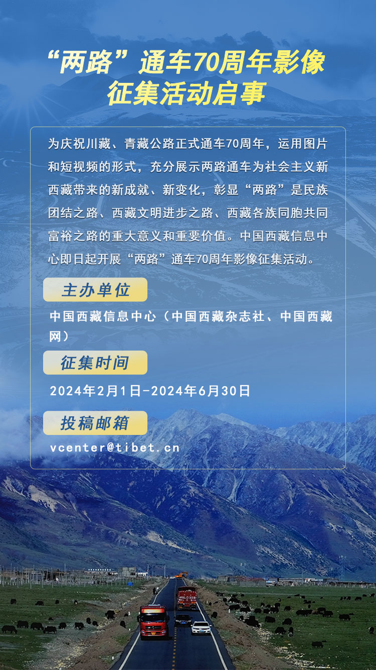 為慶祝川藏、青藏公路正式通車70周年,運用圖片和短視頻的形式,充分展示兩路通車為社會主義新西藏帶來的新成就、新變化,彰顯“兩路”是民族團結(jié)之路、西藏文明進步之路、西藏各族同胞共同富裕之路的重大意義和重要價值。中國西藏信息中心即日起開展“兩路”通車70周年影像征集活動。