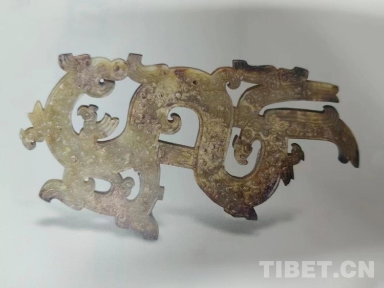最精妙的是,玉佩整體呈片狀,兩面鏤雕相同紋飾。龍張口回首,龍身滿飾谷紋,尾上雕一大鳥,龍頭內(nèi)外側(cè)及尾部又各凸雕一小鳥,于龍身中部有一圓形鉆孔。此種龍鳳佩是戰(zhàn)國(guó)時(shí)期特有的造型,手法夸張,圖紋精美,線條卷曲相連,體現(xiàn)了制作者豐富的想象力。(中國(guó)西藏網(wǎng) 綜合/周晶 攝影/楊月云)