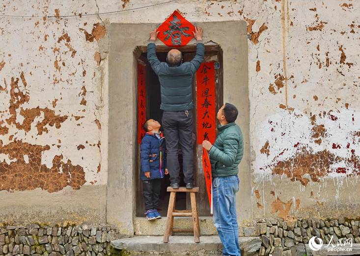 圖為貼春聯(lián)迎新年 攝影:吳靈萱 來(lái)源:人民網(wǎng)