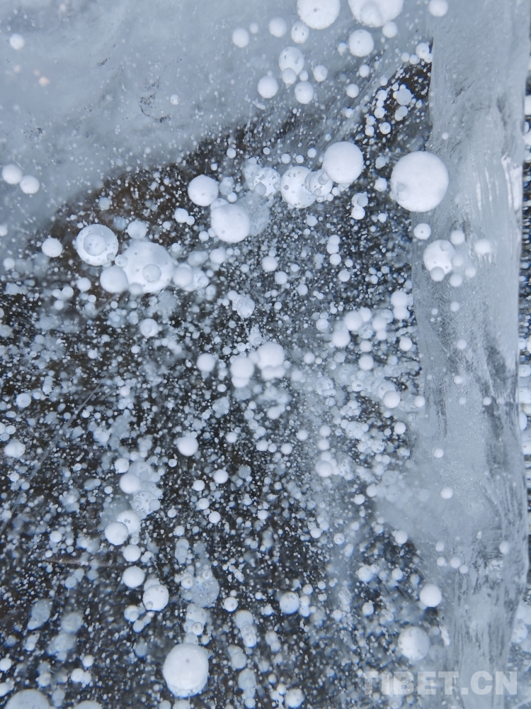 許多細(xì)小的白色氣泡懸浮在錯那湖厚厚的冰層之中。帕洛扎 攝