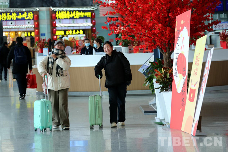 資料圖:拉薩貢嘎機場內節(jié)日氛圍濃厚 游客愉快出行