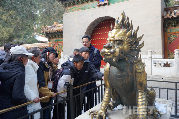 原來宮殿的排水系統(tǒng)既科學又美觀,原來屋脊神獸有避雷的作用,原來宮殿前的動物造型香爐是古代版“舞臺干冰制造器”……故宮的建造元素如此豐富,來自各個地區(qū)和民族。隨著講解員的介紹,同學們被古人的智慧深深折服,對這座皇家園林有了了解和自己的認識。站在宮殿的高處,學生們遙望到矗立的白塔,遙望到屋頂龍形裝飾的雨花閣,據(jù)說里面都是清朝皇帝收藏關于藏傳佛教的“寶物”,那里有關于西藏的歷史故事。