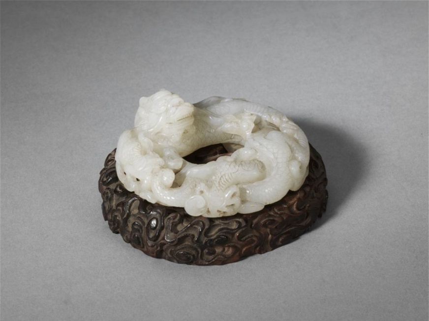 此白玉蟠龍環(huán)佩,龍雙角,龍發(fā)向后及左右兩側(cè)飄拂,發(fā)絲細(xì)而規(guī)整。龍首須眉上挑,左右長(zhǎng)須,齜牙咧嘴。龍身盤卷,五爪,禿尾,四周繚繞卷草云紋。環(huán)佩背后一側(cè)凸起方拱形穿,上高浮雕云紋。整器附紫檀木座,雕云紋,木座反面陰刻填金“丙”字,為清代宮中文物定級(jí)字樣。
