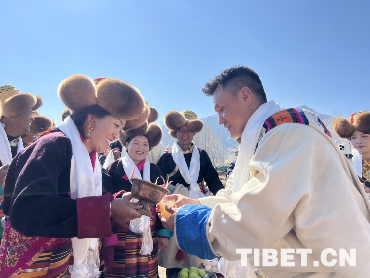 開耕儀式結(jié)束后,茶巴朗村藏戲隊(duì)成員們?yōu)樵缫褤Q好藏裝過來體驗(yàn)西藏民俗文化的游客們獻(xiàn)哈達(dá)、敬青稞酒、唱敬酒歌,游客們現(xiàn)場學(xué)起“三口一杯”與當(dāng)?shù)厝斯捕冗@美好的一天。西藏卓美旅行社負(fù)責(zé)人孫赫男介紹說:“西藏除了山水美景之外,春耕儀式也是非常具有當(dāng)?shù)靥厣奈幕枺芙o人留下深刻記憶。今天,我?guī)е鴣碜员鄙蠌V等全國各地的游客來這里體驗(yàn)春耕儀式,讓大家看看西藏當(dāng)?shù)氐娜罕娛窃鯓娱_始春天的。游客們穿著藏裝,免費(fèi)品嘗青稞酒、酥油茶、牛肉、藏雞蛋等各種農(nóng)產(chǎn)品,還和充滿熱情的當(dāng)?shù)卮迕駛兓?dòng),他們玩得非常開心。”