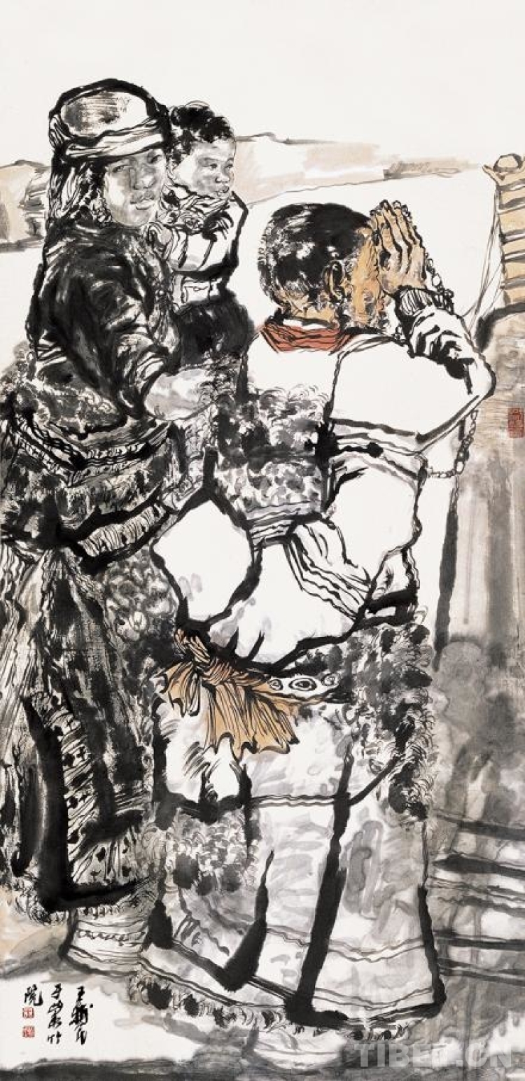 “真正深入當(dāng)?shù)厝ンw驗藏族群眾的生活,創(chuàng)作出來的作品才會真實感人?!蓖踺o民在談到藏族題材的創(chuàng)作感悟時說,“青藏高原最吸引人的地方是生活在這里的人們飽滿的精神狀態(tài)。我們要敬畏自然,尊重文化,保持充滿感情、充滿崇敬之情的創(chuàng)作情感和態(tài)度,用中國畫的水墨形式去表現(xiàn)藏族群眾的生活,去表現(xiàn)雪域的蒼茫與藏族群眾頑強不屈的性格,表現(xiàn)人與自然的關(guān)系。”