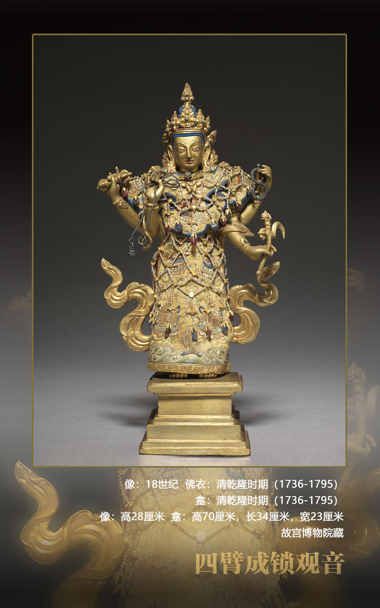 成鎖觀音,即不空羂索觀音。觀音一面四臂,分別持羂索、金剛杵、念珠、金剛鉤,在現(xiàn)在的圖像里很少找到持物相同的造像,可能是特別的傳承。觀音立姿站于方形臺座上。因其所著佛衣未曾打開,故造像身體裝飾情況不清。佛衣為清宮配做,繡工精細,上綴串珠瓔珞,極具宮廷風格。另有清宮配做紫檀木重檐亭式玻璃門佛龕,龕背面陰刻四體文題記,漢文為:“乾隆三十七年十二月十二日,欽命阿旺班珠爾胡土克圖認看供奉大利益扎什璃瑪四背成鎖觀世音菩薩。”“四背”即“四臂”的誤書。
