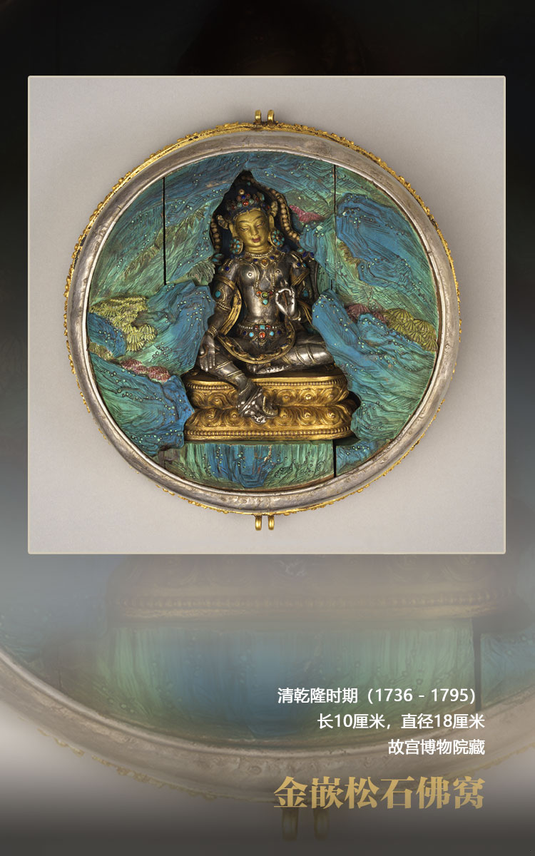 此佛窩九成金質(zhì),圓盒狀,金質(zhì)盒蓋上滿嵌梯形同心圓狀綠松石片,側(cè)面有三條松石鑲嵌的裝飾帶及蓮花紋圖案。盒蓋兩邊有可拆卸雙耳,可穿繩佩戴頸上,為護身佛盒。盒內(nèi)填染青綠木雕山洞,中間供有銀質(zhì)綠度母一尊。度母面部泥金,右手與愿印,左手說法印,身上嵌綠松石、青金石、蜜蠟等,游戲坐于飾連珠紋和俯仰蓮瓣紋的金座上。附黃紙簽一張,上書漢、滿、蒙、藏四體文題記,漢文曰:“乾隆四十五年八月初七日,班禪額爾德尼恭?;噬掀哐f壽,遞丹書,呈進大利益綠衣救度佛母古佛?!?此處“大利益”有大功德之意,根據(jù)銘文可知,這個佛窩應(yīng)是乾隆帝七十大壽時六世班禪敬獻的祝壽禮物。(文圖資料來源:澳門藝術(shù)博物館 中國西藏網(wǎng) 記者/易文文 趙佳 呂靜 王東 姚浩然)