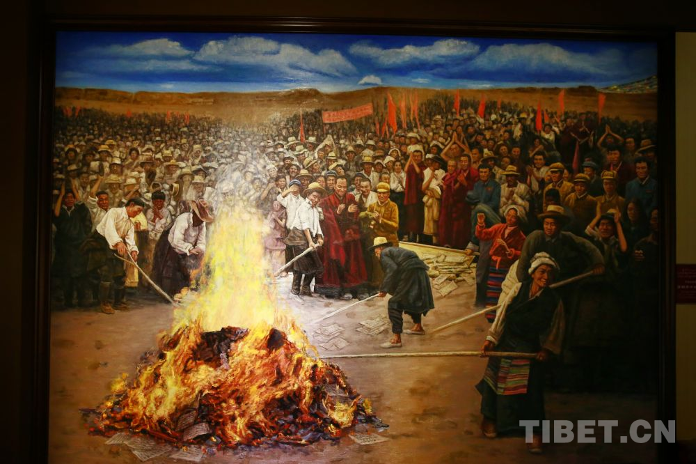 資料圖:反映達(dá)孜縣翻身農(nóng)奴焚燒契約和債券文書(shū)的美術(shù)作品 翻拍:許娜