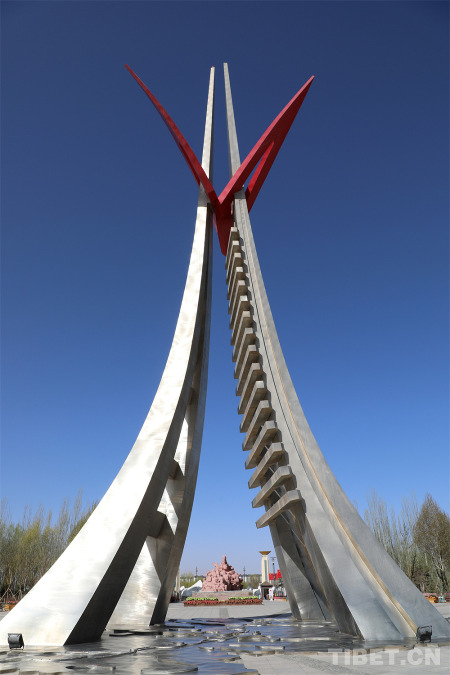 雕塑之后便是公園內(nèi)的標志性建筑——天路紀念塔,呈人字形高聳,延伸的線條分別代表著青藏公路和青藏鐵路,塔座是青藏地形圖和兩條線路的示意圖。據(jù)了解,此塔高39.16米,數(shù)據(jù)取自青藏公路和青藏鐵路里程之和3916公里。