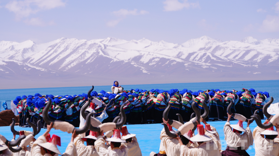 念青唐古拉山脈皚皚雪山高聳入云,清澈碧藍的納木錯湖水一望無際,牧民牽著白牦牛在湖邊悠閑地散步,成群的棕頭鷗發(fā)出歡快的叫聲在空中自由飛翔……在令人如癡如醉的絕美景色為背景的祈福儀式上,身著盛裝的300名演員結(jié)合當?shù)孛袼孜幕?,手捧哈達、牛角、烏爾朵(拋石器)等呈現(xiàn)盛大的祈福儀式,給現(xiàn)場觀眾帶來一場羌塘高原別具一格的視覺盛宴。