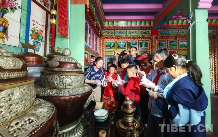 小小石榴籽,殷殷中華情。在“藏家”融情交流中,各地少先隊(duì)員在農(nóng)家一起學(xué)習(xí)制作西藏傳統(tǒng)美食糌粑、卡塞等,一個(gè)個(gè)極具創(chuàng)意造型的“小卡塞”,精致巧妙,隊(duì)員們共學(xué)、共樂(lè)、共享,體悟藏家民族風(fēng)俗,沉浸在歡樂(lè)的氛圍中。來(lái)自重慶市璧山區(qū)劍山實(shí)驗(yàn)小學(xué)五年級(jí)三班的李思穎說(shuō):“參加此次主題隊(duì)會(huì)交流活動(dòng)我非常開(kāi)心,深度體驗(yàn)了‘藏家’民俗,看到祖國(guó)邊疆鄉(xiāng)村的小康生活,豐富的活動(dòng)讓我增強(qiáng)了對(duì)中華民族優(yōu)秀文化的認(rèn)同感和自豪感,我要繼續(xù)爭(zhēng)做小石榴籽,切實(shí)鑄牢中華民族共同體意識(shí)?!?/p>
