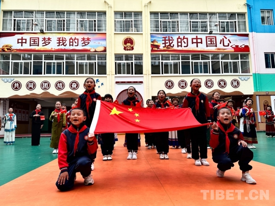 正在大課間休息的同學(xué)們,在老師的帶領(lǐng)下紛紛涌向操場,伴隨著歡快的舞曲跳起了藏族鍋莊;合唱團(tuán)的孩子們唱起了該校自主編創(chuàng)的社會主義核心價(jià)值觀24字童謠,孩子們挺拔的身姿和鏗鏘的歌聲,盡顯文化自信和民族自豪感。