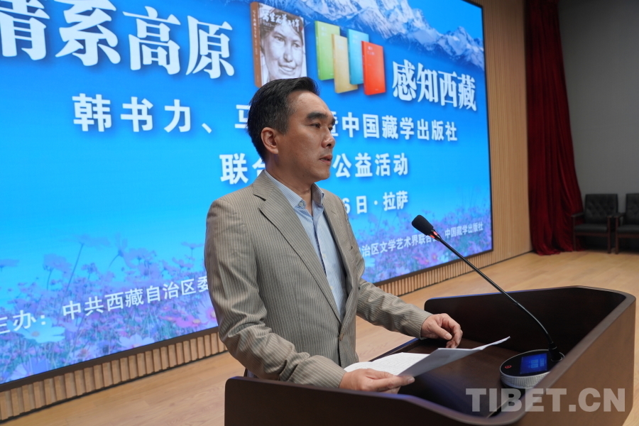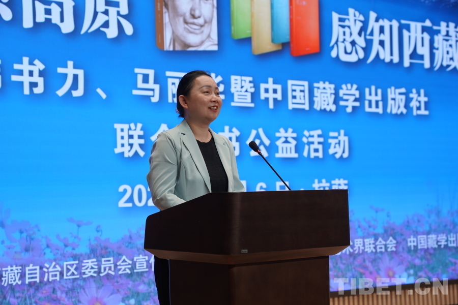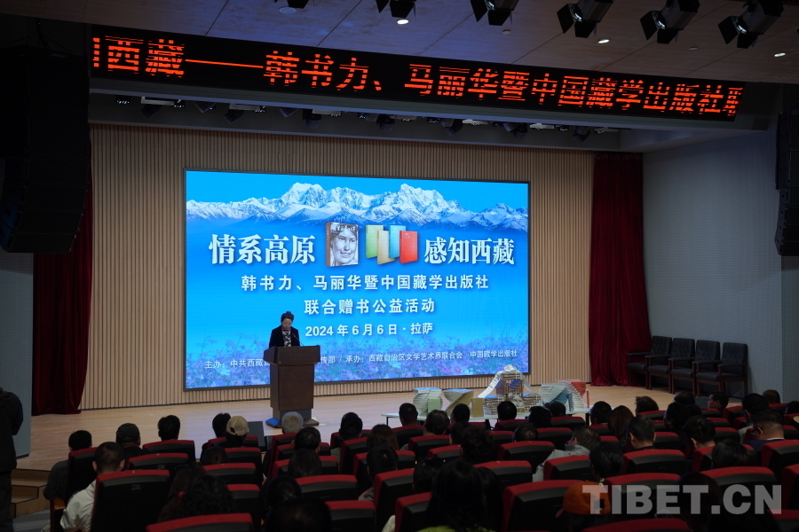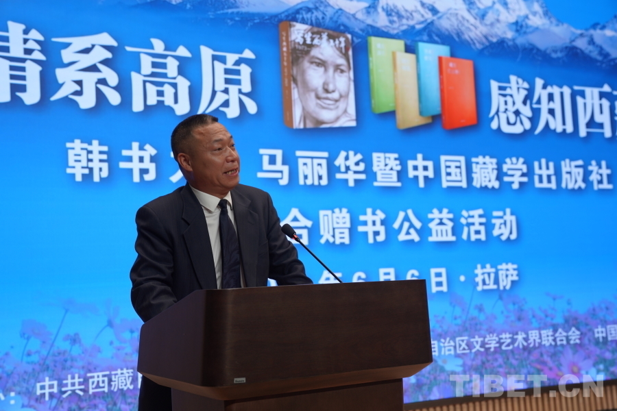 中國(guó)西藏網(wǎng)訊 6月6日上午,由西藏自治區(qū)黨委宣傳部主辦,自治區(qū)文聯(lián)、中國(guó)藏學(xué)出版社承辦的“情系高原 感知西藏——韓書力、馬麗華暨中國(guó)藏學(xué)出版社聯(lián)合贈(zèng)書公益活動(dòng)”在西藏美術(shù)館學(xué)術(shù)報(bào)告廳舉辦。自治區(qū)黨委宣傳部副部長(zhǎng)何瑞,中國(guó)藏學(xué)出版社社長(zhǎng)洪濤,自治區(qū)文聯(lián)黨組成員、副主席陳人杰,自治區(qū)黨委原常委、自治區(qū)政協(xié)原副主席德吉措姆,自治區(qū)文聯(lián)原主席、西藏美術(shù)家協(xié)會(huì)原主席韓書力,中國(guó)藏學(xué)出版社原總編輯、自治區(qū)文聯(lián)原副主席、西藏作家協(xié)會(huì)原副主席馬麗華等參加活動(dòng)。