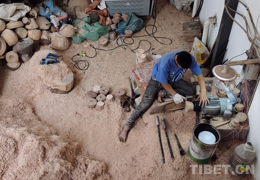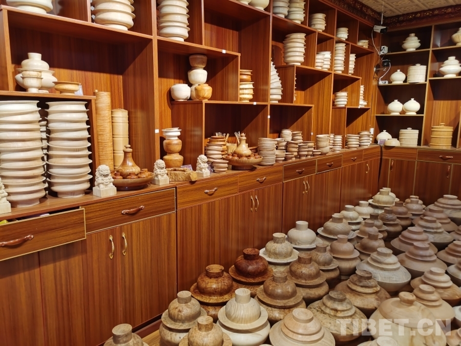 我們首先來到的是四川省非物質(zhì)文化遺產(chǎn)項(xiàng)目——藏族民間車模技藝體驗(yàn)基地。基地一層是工作區(qū),一位師傅正在全身心制作木質(zhì)生活用具,絲毫沒有察覺我們的到來。于是沒有過多打擾,我們徑直來到二樓展品陳列區(qū)。藏族民間車模技藝傳承人格絨次仁的兒子洛絨次仁拿起一個(gè)木碗,臉上露出樸實(shí)而靦腆的微笑介紹道,“這些都是選用樹瘤制作而成,一般選用鵝掌木、杜鵑等15類樹木,因?yàn)橹蹦救菀琢验_。為了用具不裂開,處理后的樹瘤煮水后需晾干五至六個(gè)月,一個(gè)木碗制作工序可能要長達(dá)半年才能完成。此項(xiàng)技藝在家族傳承至今已有四代,我們要做就做好一點(diǎn)?!甭褰q次仁大哥希望更多人能了解這項(xiàng)非物質(zhì)文化遺產(chǎn),有更多人愿意來傳承學(xué)習(xí)這份技藝,有更多人喜歡他們制作的這些木質(zhì)生活用具。