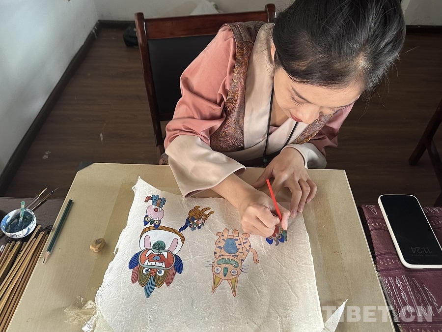 圖為畫(huà)師梁佩如在東巴紙上繪制瓦貓 攝影:楊眉笑
