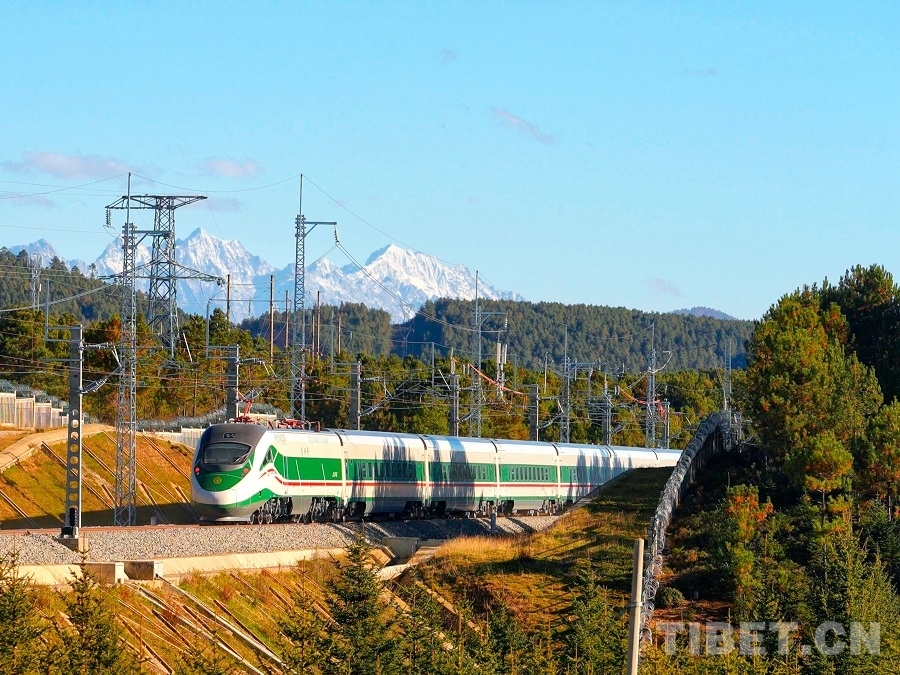 圖為復(fù)興號(hào)動(dòng)車(chē)組行駛在滇藏鐵路麗香段上 迪慶日?qǐng)?bào)社供圖