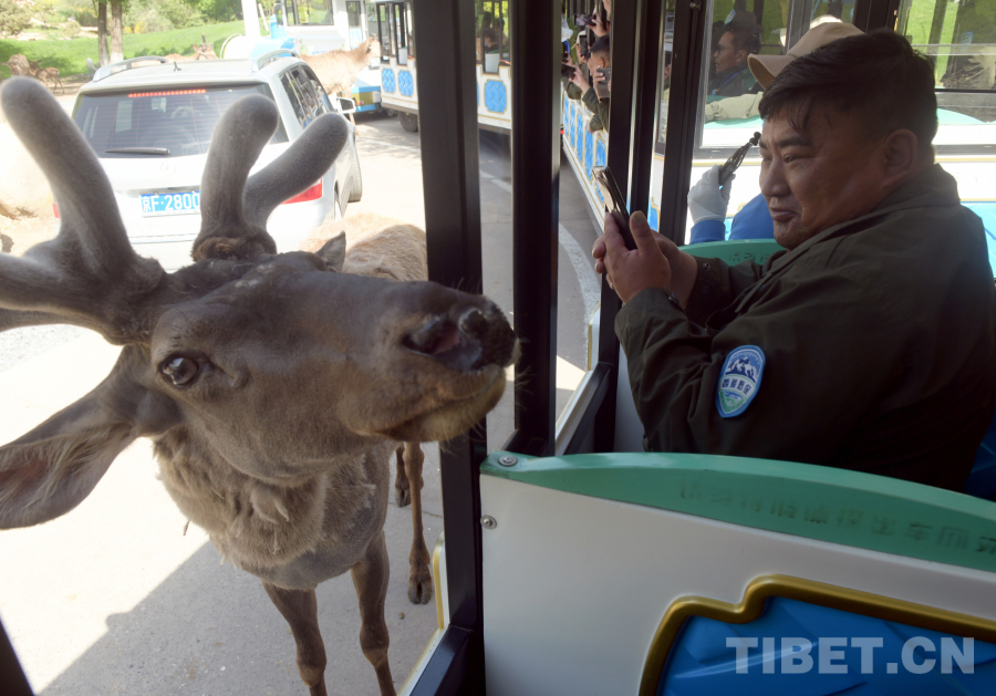 圖為西藏野保員在北京野生動(dòng)物園參觀時(shí),一只梅花鹿好奇地探頭到觀光游覽車(chē),與西藏野保員親密接觸(唐召明2024年4月24日攝)