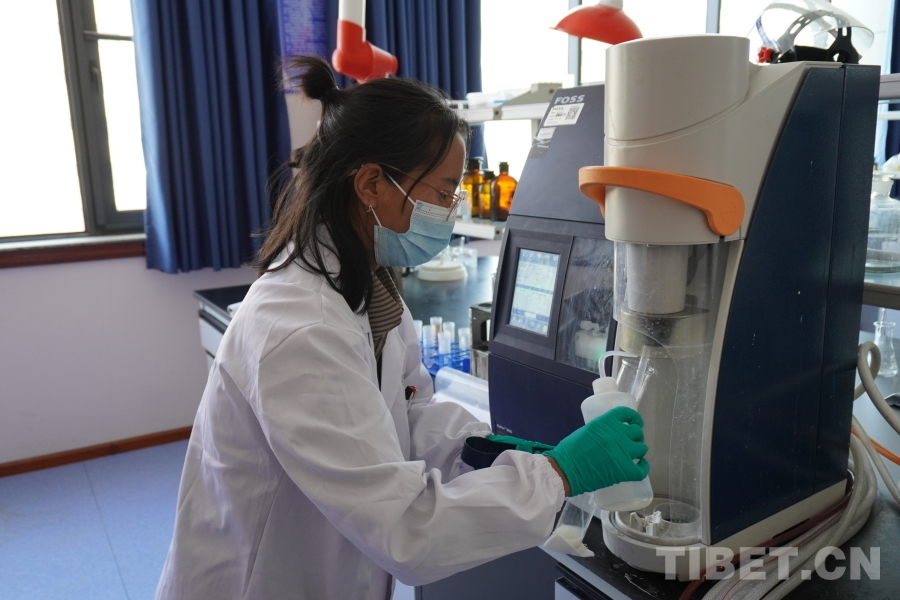 圖為畢業(yè)生尼瑪瓊決正在實驗室檢測樣品肉的新鮮度 攝影:張曉琪