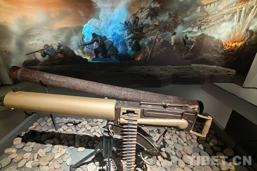圖為宗山號角——紀念西藏江孜抗英保衛(wèi)戰(zhàn)120周年主題展現(xiàn)場,英軍當(dāng)時使用的馬克沁機槍模型(前),藏軍使用的土炮(后),背景為相關(guān)歷史場景的視覺還原。馬克沁機槍是全自動機槍,也是當(dāng)時殺傷力較大的武器,理論射速達600發(fā)/分鐘 攝影:楊月云