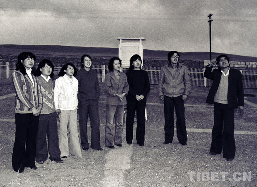 五道梁氣象站副站長尹憲志(右一),在向同事介紹當地氣象情況(唐召明1987年攝)