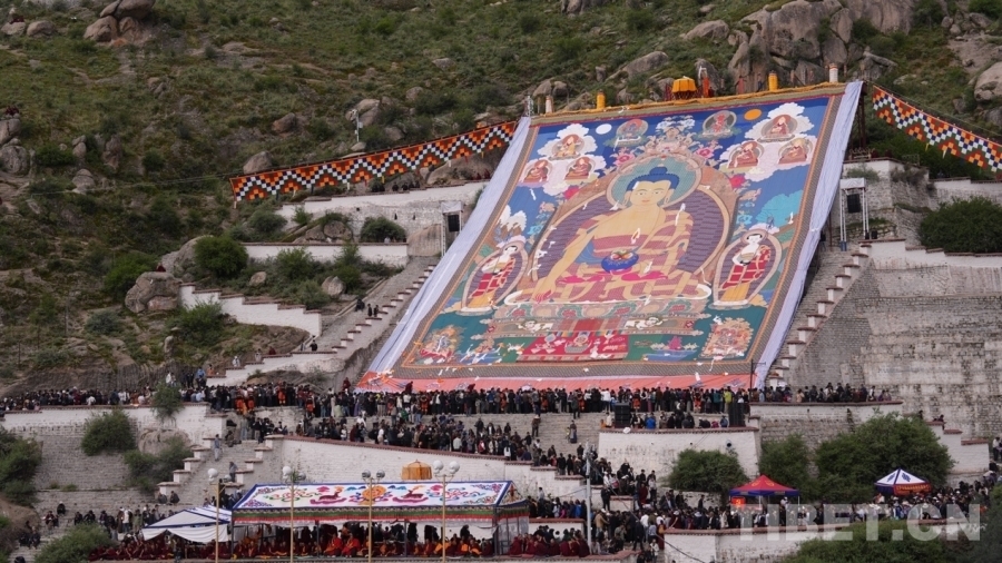 中國西藏網(wǎng)訊 8月4日,哲蚌寺背后的半山腰上,伴著莊嚴(yán)的法號聲,巨幅釋迦牟尼像唐卡緩緩展開,吸引著數(shù)以千計的信教群眾和來自世界各地的游客,場面蔚為壯觀。