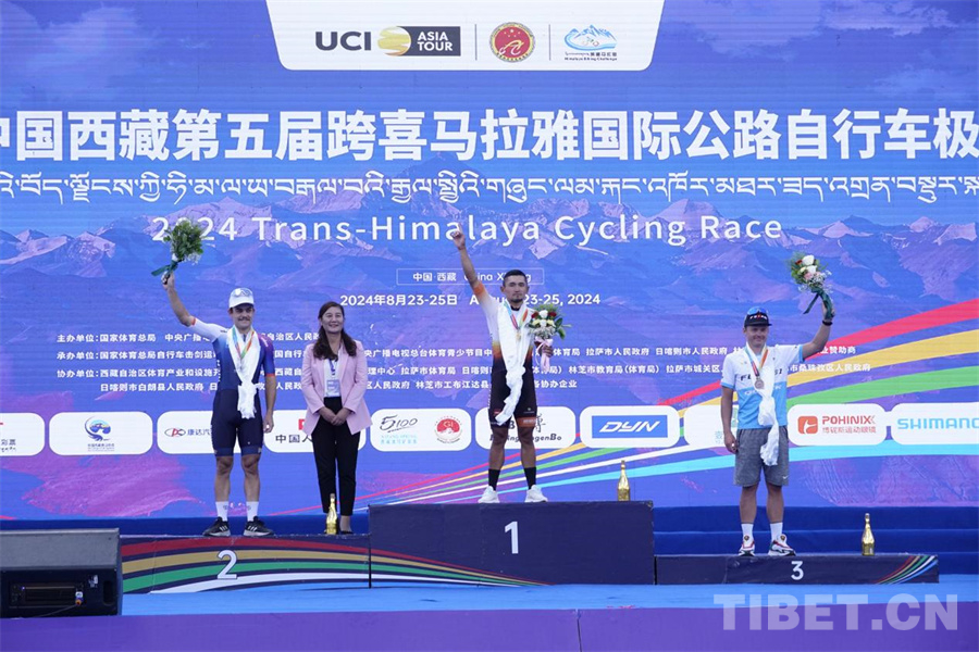 圖為日喀則賽段前三名,同時(shí)該段第一名CHIA BERMUDEZ Luis Carlos摘下個(gè)人沖刺總積分的桂冠 攝影:邊子捷