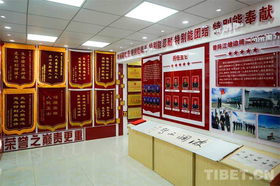 在普瑪江塘邊境派出所,“精神力量”永遠比“榮譽之墻”更加重要。一面面錦旗掛滿了墻壁,卻將“榮譽之巔責更重,頂峰之處旗更紅”寫在錦旗之下;墻上的每一張照片都是一段不可抹去的記憶,卻將“特別能吃苦、特別能戰(zhàn)斗、特別能忍耐、特別能團結、特別能奉獻”的“老西藏精神”高懸照片之上。