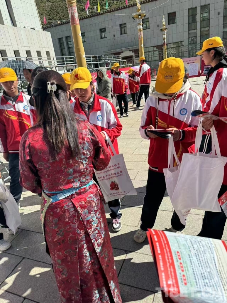 圖為工作人員為學(xué)生發(fā)放宣傳資料 圖片由比如縣委統(tǒng)戰(zhàn)部提供