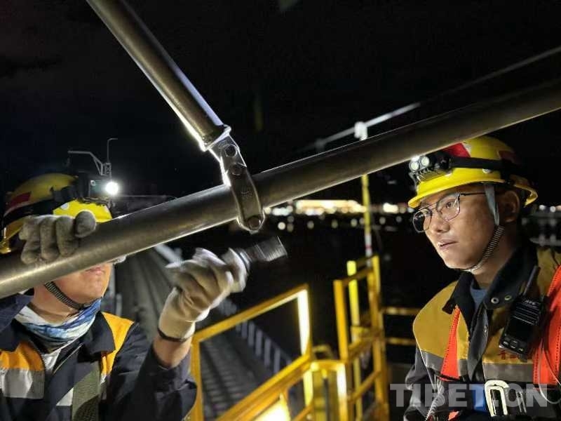 23時(shí)00分,軌道車穩(wěn)穩(wěn)??浚疤齑啊弊鳂I(yè)命令下達(dá)。中國(guó)鐵路青藏集團(tuán)有限公司拉薩基礎(chǔ)設(shè)施段供電維修技術(shù)中心拉薩南接觸網(wǎng)維修隊(duì)工長(zhǎng)李積王帶著7名工友走下接觸網(wǎng)作業(yè)車,驗(yàn)電、連接地線端、接掛地線……一系列操作一氣呵成。隨即,現(xiàn)場(chǎng)負(fù)責(zé)人拉加和工友們依次登上距離地面6米高的作業(yè)平臺(tái)上,穿梭于接觸網(wǎng)線索之間,猶如凌空“舞者”。
