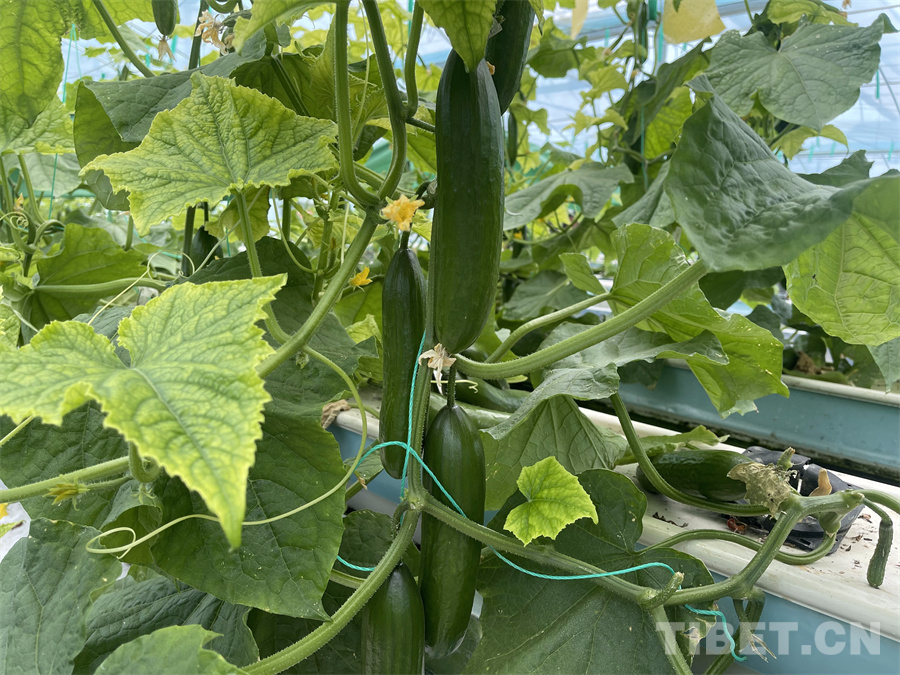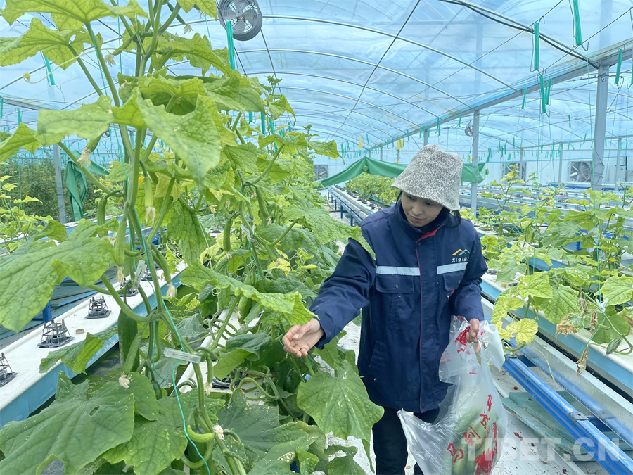 圖為八宿縣白瑪鎮(zhèn)產(chǎn)業(yè)園區(qū)內(nèi),工作人員正在采摘無(wú)土栽培出的成熟黃瓜 攝影:王妍丹