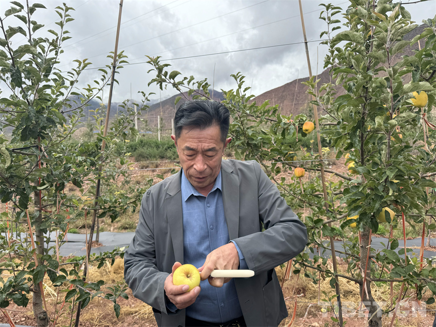 圖為煙臺(tái)大山果業(yè)開(kāi)發(fā)有限公司高級(jí)農(nóng)藝師曲寶君正在拿機(jī)器測(cè)試維納斯黃金蘋果的糖分 攝影:王妍丹