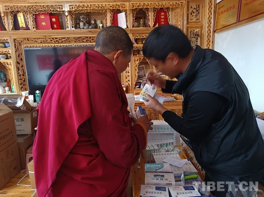 圖為工作人員照方為覺(jué)姆發(fā)放藥品并講解服用注意事項(xiàng) 攝影:賈春玲