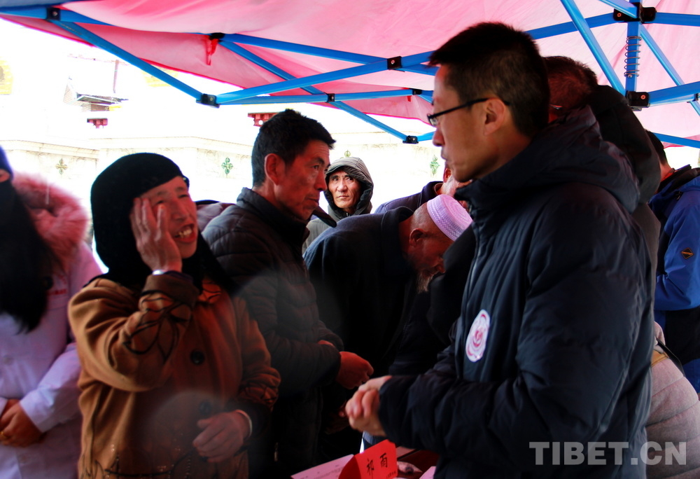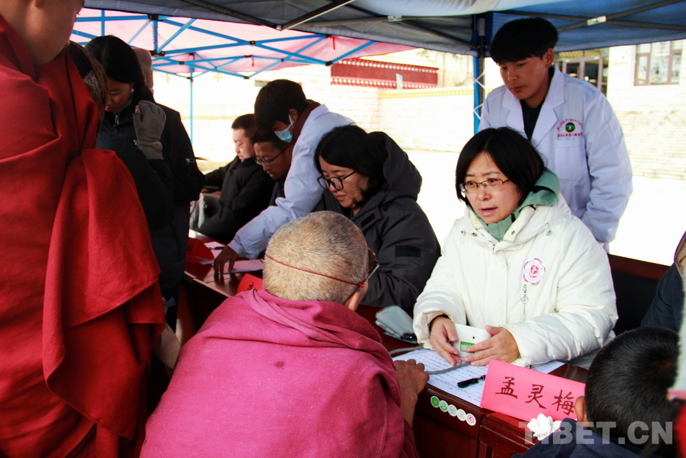 在郎木寺義診點(diǎn),此前為了容納更多群眾就診,因此將義診點(diǎn)設(shè)在了寺院門外的小廣場。盡管大雪紛飛,但提前得知義診消息的群眾已經(jīng)陸續(xù)趕來,擔(dān)心臨時(shí)更換義診場所影響后續(xù)前來的群眾就診,醫(yī)務(wù)志愿者們毫無怨言地在臨時(shí)搭起的防雨棚下按時(shí)開始了義診。