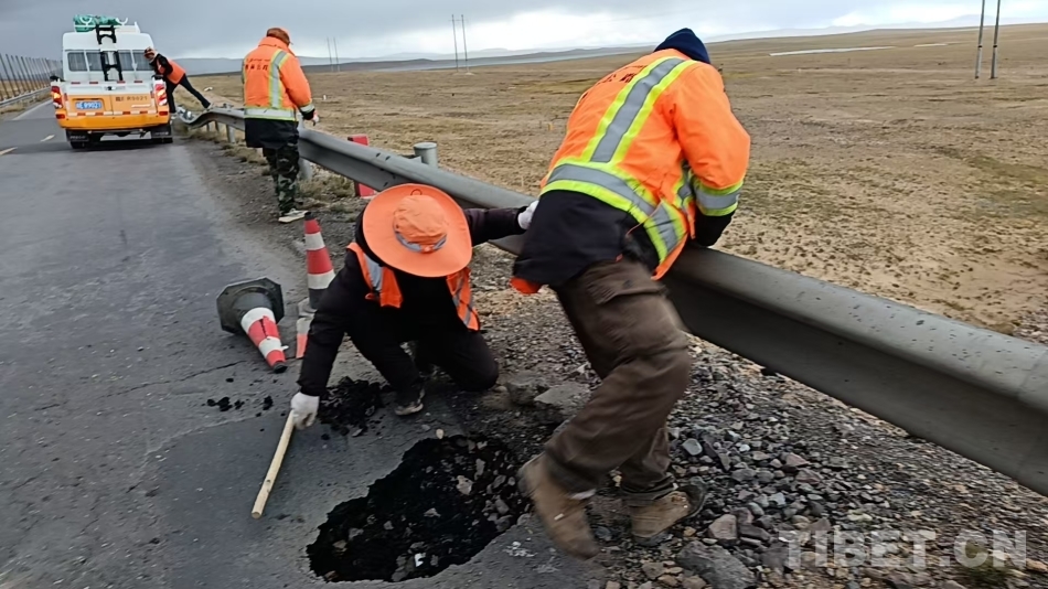 圖為養(yǎng)路工人在修補破損路面