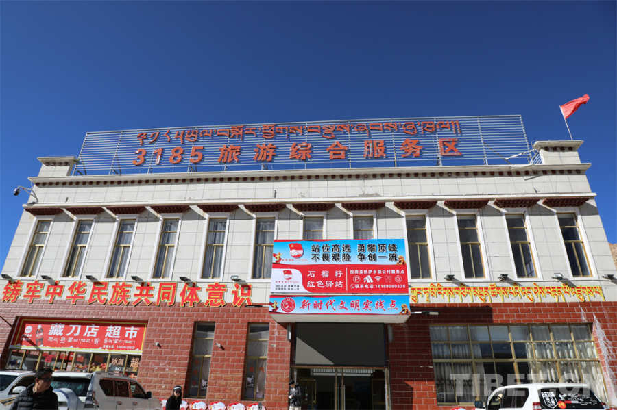 在西藏日喀則市拉孜縣熱薩鄉(xiāng)強(qiáng)公村,318國(guó)道5000公里紀(jì)念碑廣場(chǎng)上很多游客在三五成群拍照留念,廣場(chǎng)旁邊的樓房里也熱鬧非凡。樓里的石榴籽紅色驛站里,休息、喝水、充電等服務(wù)一應(yīng)俱全,還有當(dāng)?shù)鼐用裨诖虽N(xiāo)售手工藝品、食品、特產(chǎn)等?!袄淇扇∨?、熱可納涼、渴可喝水、急可如廁、累可歇腳、傷可用藥”的“紅色驛站”也吸引更多游客在此駐足。