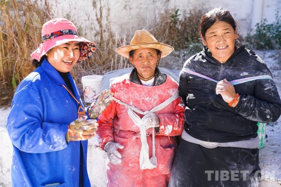 在布達(dá)拉宮粉刷現(xiàn)場,有每年都堅(jiān)持參與的拉薩市民,有從遙遠(yuǎn)昌都、那曲等地專程趕來的群眾,亦有冬游西藏恰巧遇到參與其中的外地游客。他們不分年齡、不分性別,一起在拉薩溫暖的秋日暖陽中用熱情洋溢的笑臉參與到這一“甜蜜”的粉刷活動(dòng)中來。