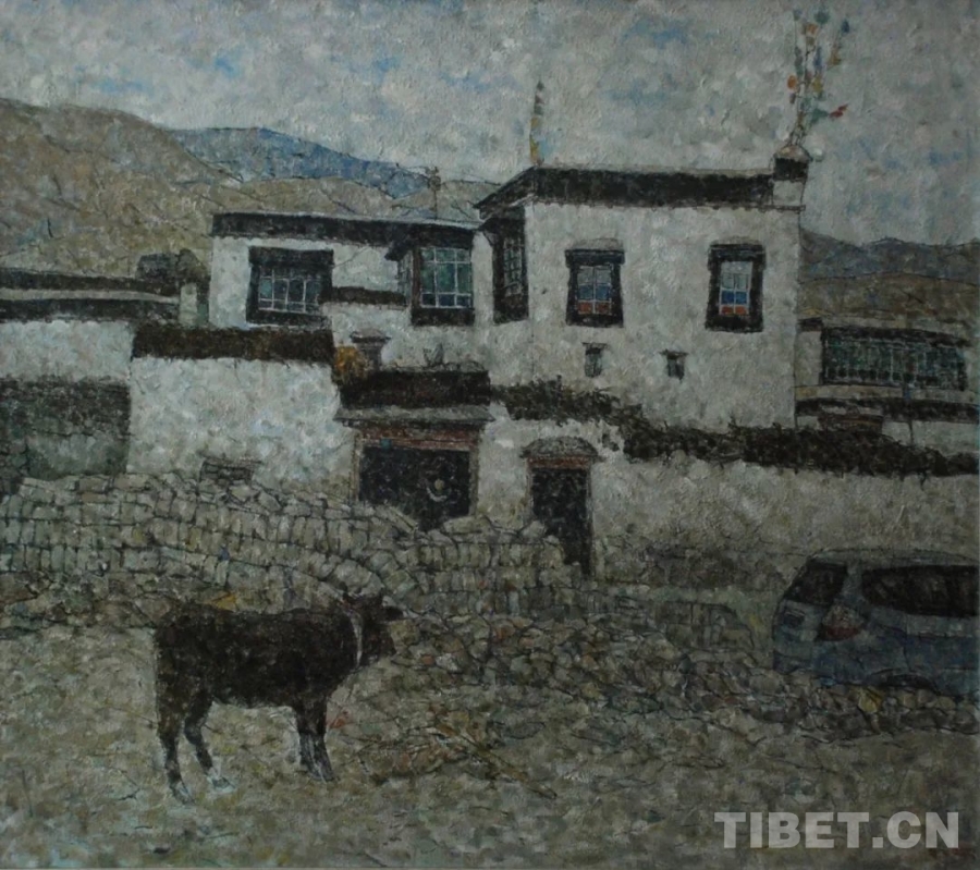 圖為“藍天白云——雪域高原油畫作品巡展”作品《村寨新景》(120x140cm 布面油畫)作者:格桑次仁