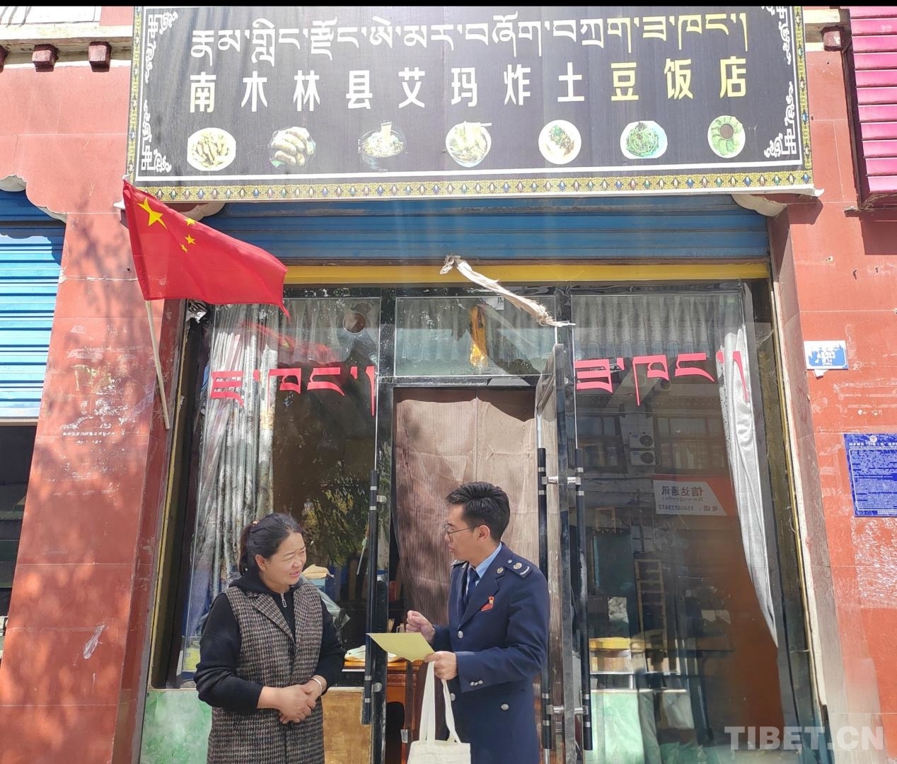 圖為稅務工作人員為南木林縣艾瑪炸土豆飯店工作人員講解相關政策