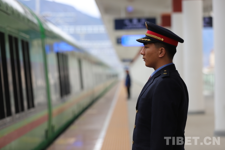 圖為拉薩車站工作人員正在迎接進(jìn)站列車