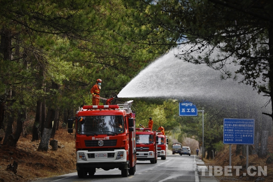 圖為消防員沿重點(diǎn)林區(qū)道路開展灑水增濕作業(yè)