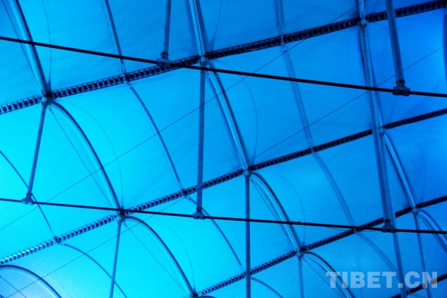 圖為三亞市體育中心體育場(chǎng)內(nèi)部的玻璃結(jié)構(gòu)反射的藍(lán)色燈光 攝影:劉莉