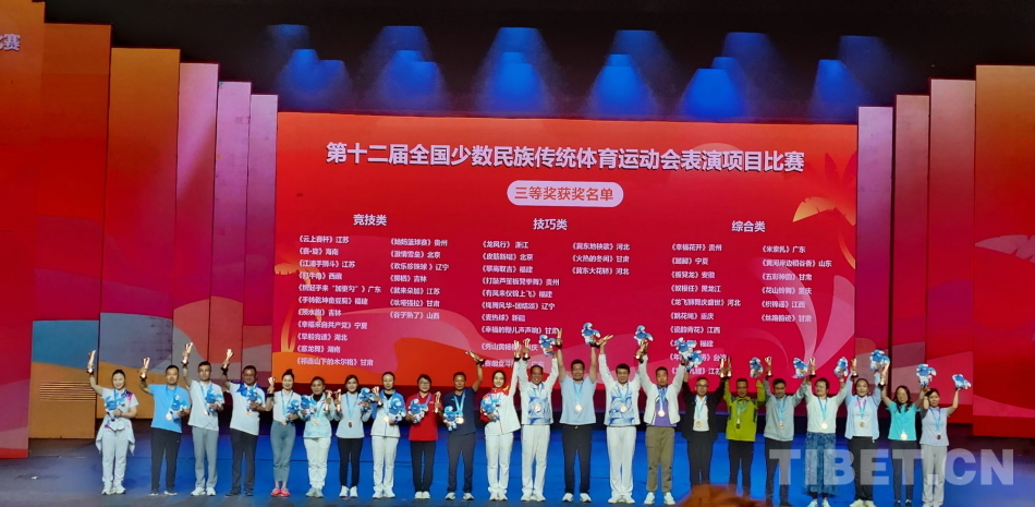中國西藏網(wǎng)訊 11月29日晚,第十二屆全國少數(shù)民族傳統(tǒng)體育運動會(以下簡稱“運動會”)表演項目頒獎晚會在海南三亞舉行。本屆運動會表演項目共計170個,共決出54個一等獎。其中,西藏隊獲得3個一等獎。